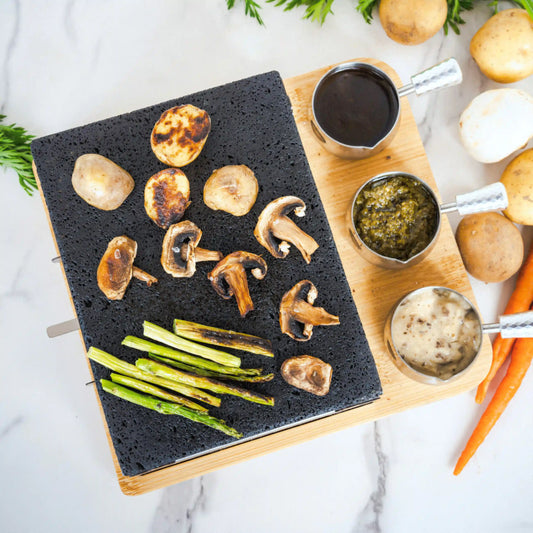 "Premium Raclette Lavastein-Grillset" - Natur-Lava-Stein / inkl. 3 Soßen-Töpfe – Bambusbrett für stilvolles Grillen