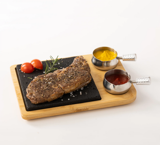 "Premium Raclette Lavastein-Grillset" - Natur-Lava-Stein / inkl. 3 Soßen-Töpfe – Bambusbrett für stilvolles Grillen