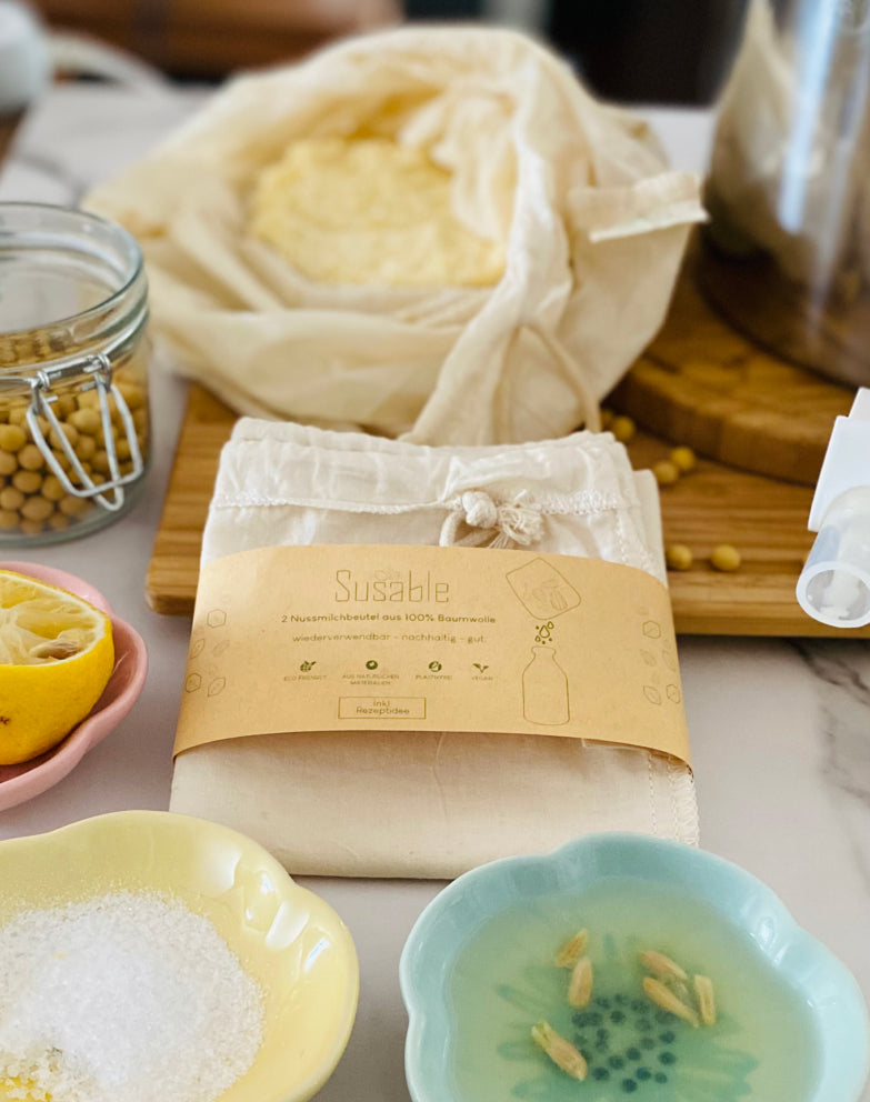 Reduzieren Sie Verpackungsmüll durch selbstgemachte Milchersatzprodukte und nutzen Sie den Beutel immer wieder dank einfacher Reinigung.